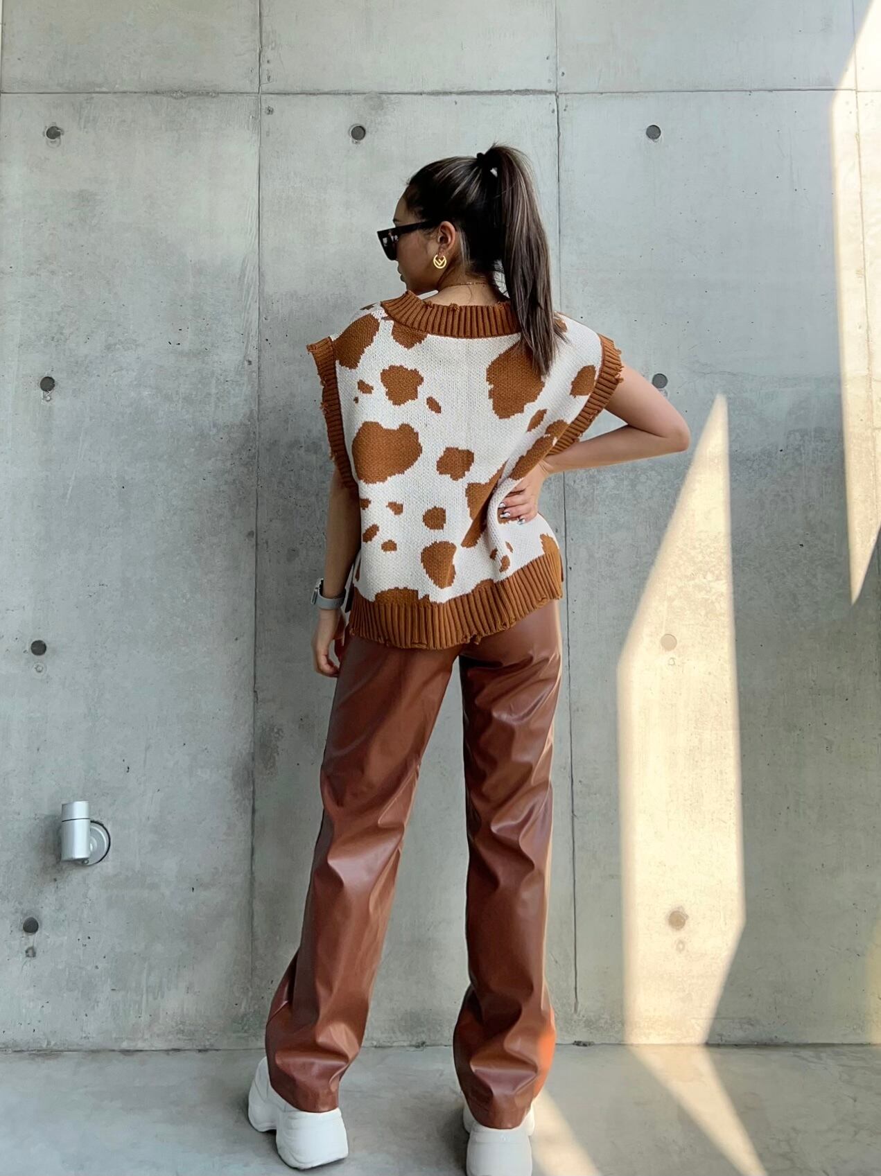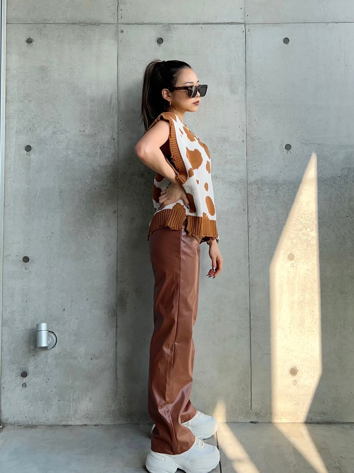 ・合皮レザーのストレートパンツ。
